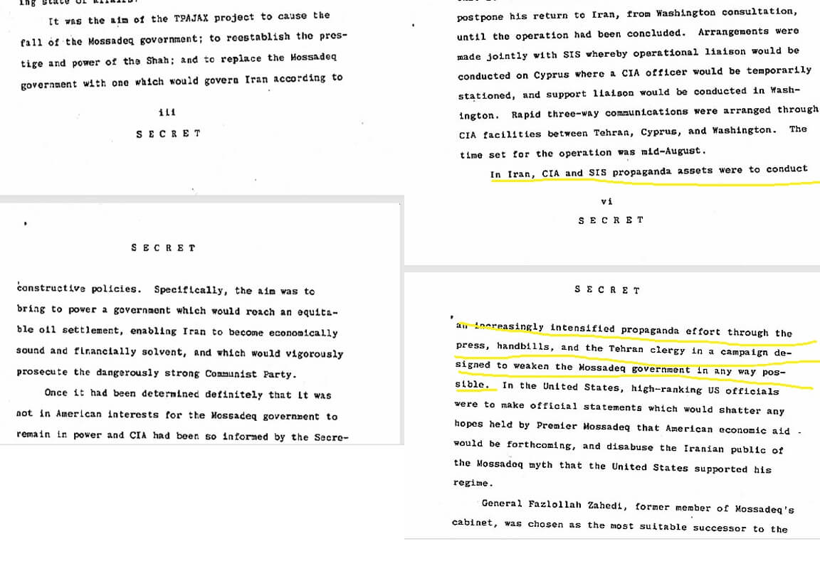 Operation TPAJAX of 1953, that perhaps became the reason for the start of 1979 Islamic Revolution. In 2013, after decades of legal battles by National Security Archives, after leaks in the New York Times in 2000, CIA officially published memoirs of its direct involvement in the coup to overthrow Mossadeq’s democratically elected parliament in 1953, and bringing Iran under direct monarchy of Reza Shah Pehlavi, because of the fear that Mossadeq’s policy for nationalization of the oil companies will disrupt cheap global supply to the West. The coup brought the country to the brink of a civil war with infights within the military ranks between Shah loyalists and those upholding Mossadeq’s legal government. Political as well as religious propoganda was used to incite sentients against Mossadeq.